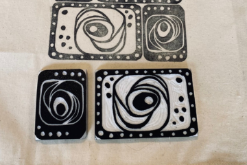 The workshop begins with developing a simple design suitable for relief printing, exploring how positive and negative space works in stamped imagery.